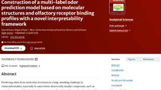 人間の嗅覚プロセスを模倣して、分子構造から受容体の反応を経て匂いを予測し、その根拠まで可視化できる多段階モデルを開発しました!![金子研論文] 金子研の研究成果の論文が Analytical Sciences に掲載されましたので、ご紹介します。タイトルはConstruction of a multi-label odor prediction model based on mol... 2026.04.19 ケモインフォマティクスケモメトリックスデータ解析プログラミングプロセス制御・プロセス管理・ソフトセンサー研究室研究発表論文