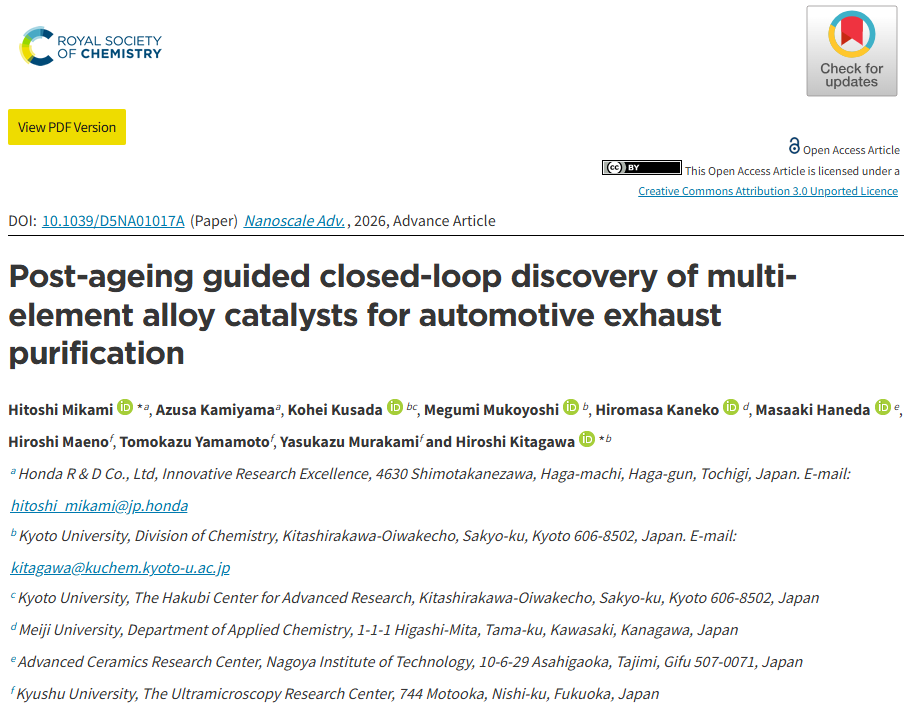 本田技術研究所をはじめとする複数機関と金子研における共同研究の成果の論文が Nanoscale Advances に掲載されましたので、ご紹介します。タイトルは